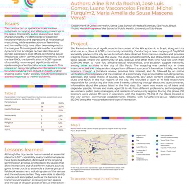 Este estudo teve como objetivo identificar e caracterizar espaços de lazer e sociabilidade onde a comunidade de homens gays, bissexuais e outros homens que fazem sexo com homens (GBHSH) se reúne para se divertir, cultivar relações afetivo-sexuais, estabelecer redes de apoio, dentre outras atividades, na cidade de São Paulo/SP.